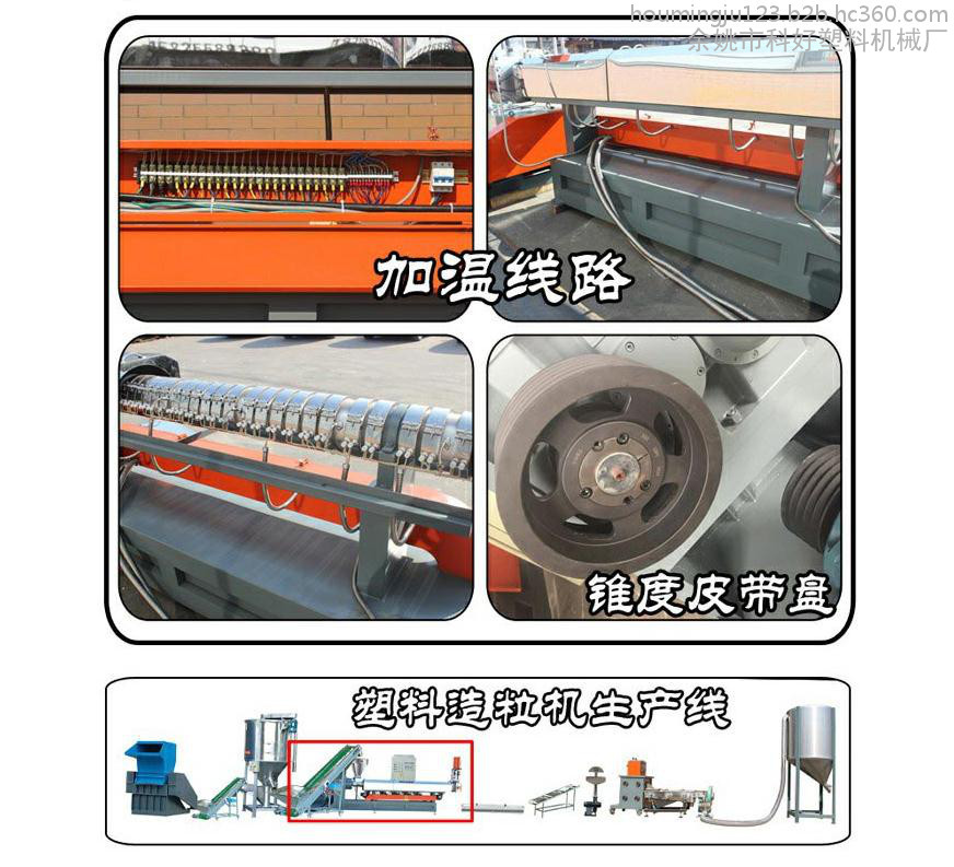 4:造粒机具有高产量低能耗的特点,大扭矩减速箱及电动机,本机螺杆经过特殊设计,具有无死角不卡铁效果,有效提高了产能,增加塑料塑化效果,设有单排气、双排气结构,干料、潮料、水洗料均能充分排水排气,使颗粒结实饱满光泽度强。