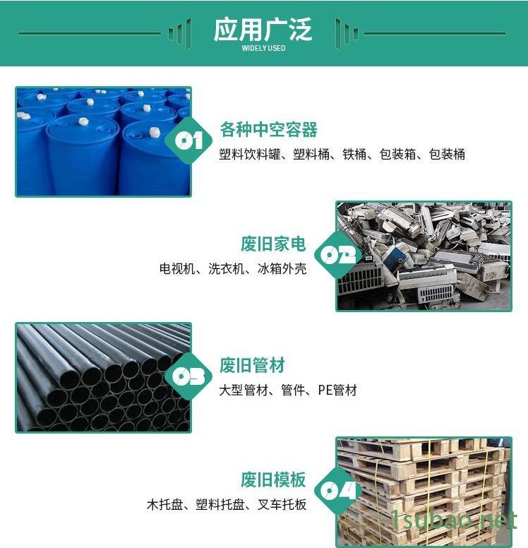 能粉碎一般粉碎机不能粉碎的物料:大块料、筐料、管材、板材、木材、轮胎、大卷薄膜等。此产品是特厚板材精密加工的组合结构外框,大角度六角柱的旋转轴,大口径坚固投入料斗,所以大物料可放心粉碎;