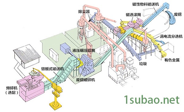 破碎机工作时,在电动机的带动下,转子高速旋转,待破碎物料进入破碎腔后,在下落的过程中被数层转子上的耐磨锤头高速击打、碰撞、剪切撕碎并反复揉搓撞击而破碎,铁锈、油漆等杂物被逐渐剥离, 后从下端的出料口排出;破碎后的混合料经过输送机、磁选机,把硅钢片和铜(铝)分类堆放。