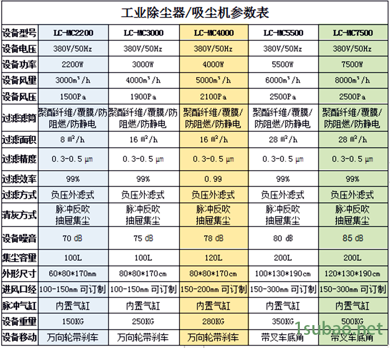 工业除尘器、吸尘机配置功率:1.1KW、2.2KW、3KW、4KW、5.5KW、7.5KW等。