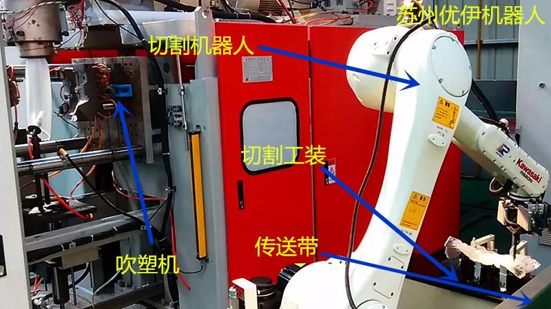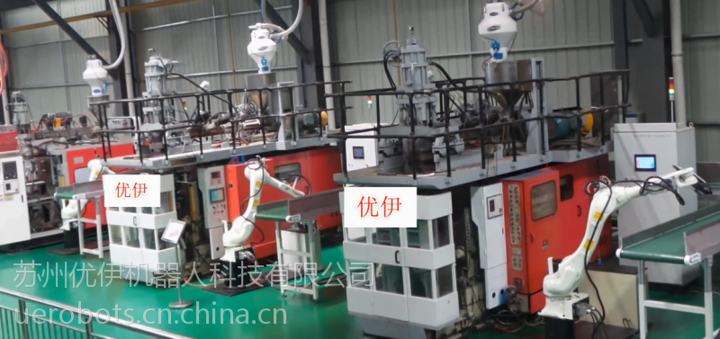 图中为工业机器人和吹塑机做成的生产线,采用工业机器人下料,切割,节省了大量人工,提高了生产效率,全程PLC控制,触摸屏监控,能更好的监视设备的运作流程,由于采用机器人操作,很好的降低了产品的不良率,提高了产量和质量。有良好的性价比。