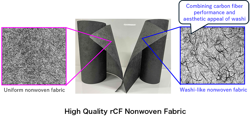 该技术生产的再生碳纤维强度高于传统再生碳纤维,并最大限度地减少了后处理过程中的纤维断裂。其低树脂残留和优异的表面质量使其能够应用于更多不同的领域。尤其值得一提的是,将短纤维分散并加工成片状无纺布的尝试已取得成功。利用该技术生产的再生碳纤维具有可控的水分散性,既可用于制造均匀结构的无纺布,也能呈现类似和纸(日本传统纸张)的独特纹理。这种新型织物结合了碳纤维的功能性(包括射频屏蔽和导热性)以及和纸的美观性。东丽公司致力于将这种新型材料的应用拓展到众多行业。
