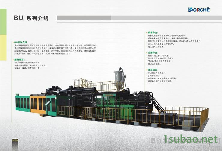博创拥有保持世界同步**地位的BU威龙两板系列、BS伺服节能系列、BH混合动力系列、BM多色机系列、BT挑战者系列等近100种规格型号的注塑机;产品主要锁模力从30吨~6800吨,注射量为25g~300000g,并提供“量体裁衣”、“一站式售后服务”。2013年自主研发出亚洲**大的6800吨伺服节能两板式注塑机,已交付山东客户生产检查井。6800吨的问世,填补了我国自行研发制造超大型注塑机的空白,开启了国产注塑机的新纪元。