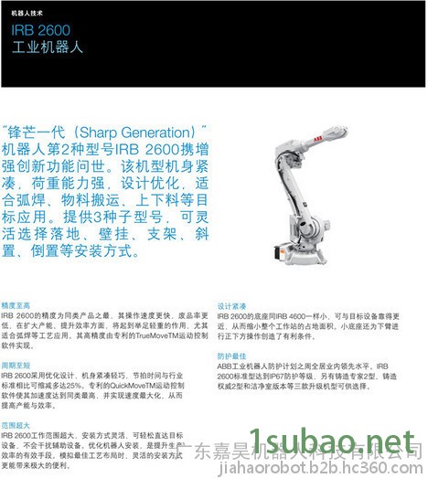 IRB 1600的有效荷重可选择6 kg或8 kg(无手腕时 高 可达12 kg),是同级别机器人中功率 强大的一款产 品,真正实现物尽其用。