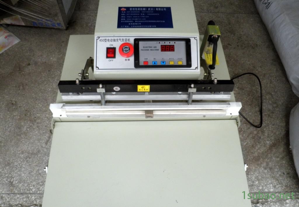 450电动抽充气包装机,可以抽真空也可以充气,是一款多功能的机器,包装袋封口尺寸不要大于45cm即可,外抽真空机没有体积的空间限制,使用范围广。