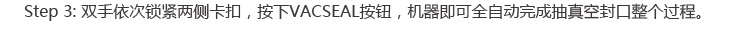 1。全自动智能型:放好袋子,锁紧两侧卡扣,按下VACSEAL真空密封按钮,机器启动抽气,抽完气后,机器自动启动封口,封好口后,机器自动停机。